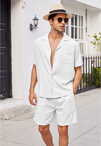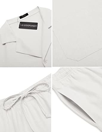 COOFANDY Men's Linen Shirt Short Sleeve Button Shirt Beach Hawaii 2 Piece Shorts Set